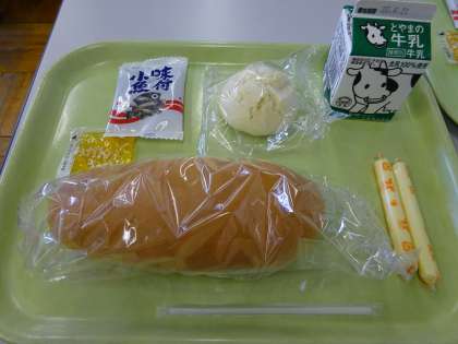 今週は、簡易給食です。今日のメニューはコッペパン、牛乳、棒チーズ、蒸しパン、味付小魚、みかんジャムです。