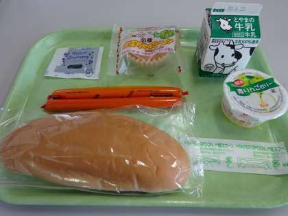 今日のメニューは、コッペパン、牛乳、ウインナーソーセージ、カボチャマフィン、青リンゴゼリー、ブルーベリージャムです。おいしくいただきました。