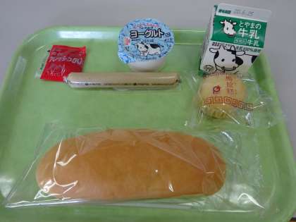 今日のメニューは、コッペパン、牛乳、魚肉ソーセージ、黒糖蒸しパン、ヨーグルト、いちごジャムです。簡易給食もあと1日です。