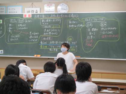 6時間目に「友情を築くこと、友情のあり方について考えよう」をテーマに、ライフスキルを行いました。これまでの友人関係を振り返りながら、友人と知人の境界線を考えたり、例文を読んで付箋に意見を書いたりと、今後の学校生活に生かせるよう、たくさんの考えを共有することができました。