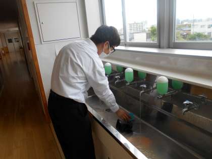 学級の保健体育係さんが、週末の黒板消しクリーナーを洗う仕事をしてくれています。1週間分のチョークの粉が、容器の中にたくさんたまっていました。その後、チョークの粉で汚れた洗面所をスポンジできれいに掃除してくれました。