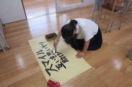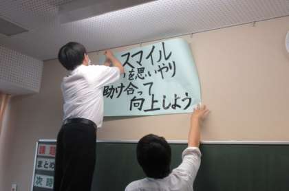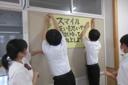 学年生徒会のメンバーが協力して、学年目標を掲示しました。「スマイル〜互いを思いやり、助け合って向上しよう〜」です。学年掲示板と各学級の前面に掲示してあります。