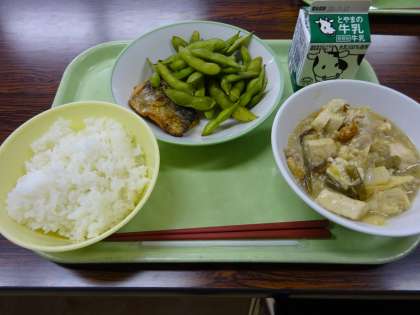 今日から通常の給食です。メニューはごはん、牛乳、さばの塩焼き、枝豆、豆腐と野菜のうま煮でした。