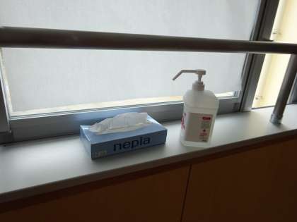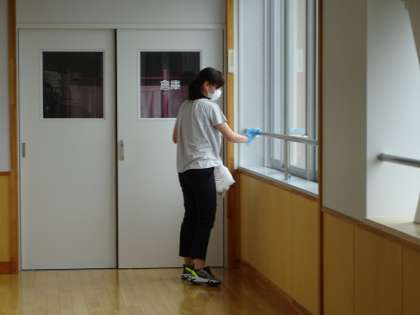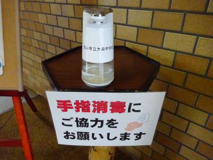 毎朝の検温ありがとうございます。玄関での健康観察は今後も継続します。校内では、毎日手すり等を消毒しています。また、来校者にも正面玄関にもアルコール消毒をおいて協力していただいています。