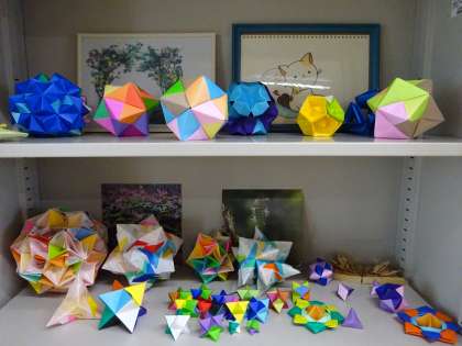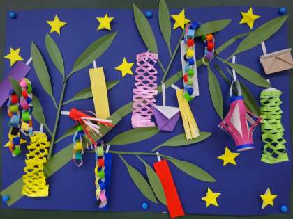 適応指導教室の掲示です。素敵な七夕や折り紙で作った立体が展示されています。廊下には、素敵な詩やイラストが掲示されています。