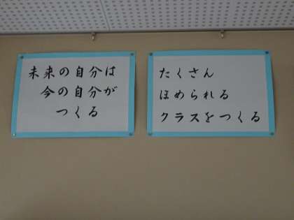 2学年の教室に、学級目標や担任の思いが掲示してあります。