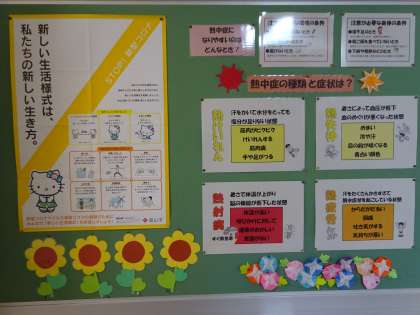 保健室前の掲示です。新型コロナウイルス感染症対策に加えて、熱中症対策もしましょう。手洗い、うがい、水分補給、マスクの着用等を継続しましょう。
