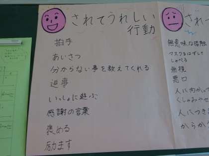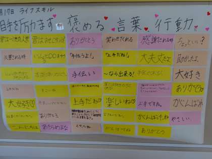 1学年では、相手を励まし、褒める言葉やされて嬉しい行動について、ライフスキルを通して学びました。教室にたくさんの言葉と行動が掲示されています。教室の中に温かい心のこもった言葉が飛び交う学級・教室になりそうですね。