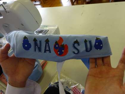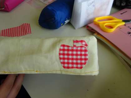 家庭科では、ティッシュボックスカバーを作っています。各自工夫を凝らしてかわいい模様を付けています。おいしそうなナス、リンゴですね。もうすぐ完成です。