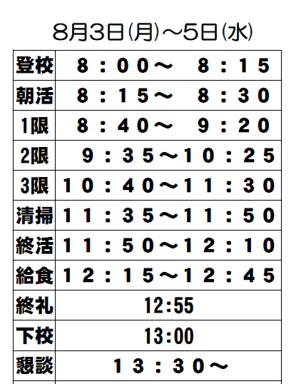 8月3日から5日まで、期末考査と保護者懇談会です。部活動はありません。