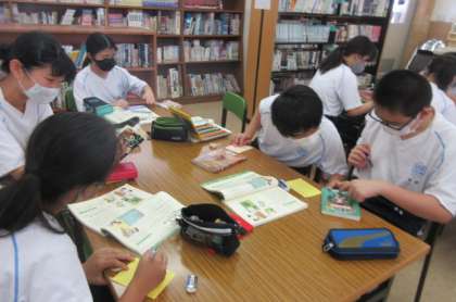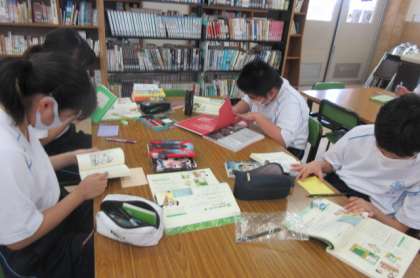 「読書紹介」を作成しています。図書室で授業を行いました。