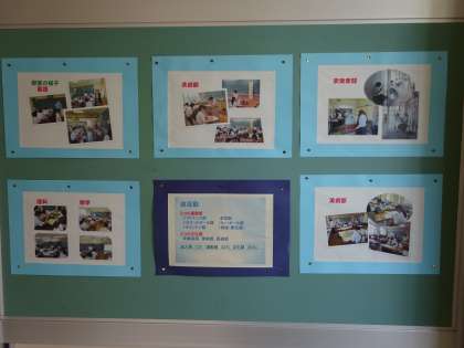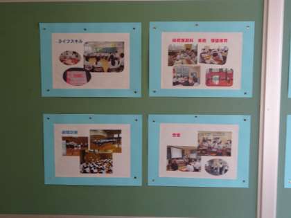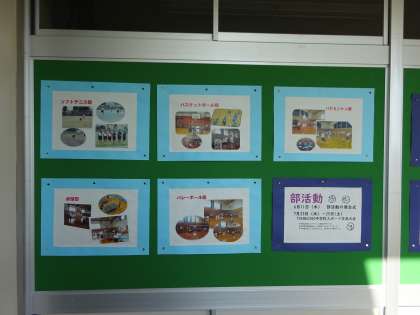 視聴覚室前の掲示が新しくなりました。部活動、授業のようす、体育大会に向けての取組の写真です。見に来てくださいね。