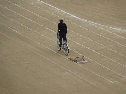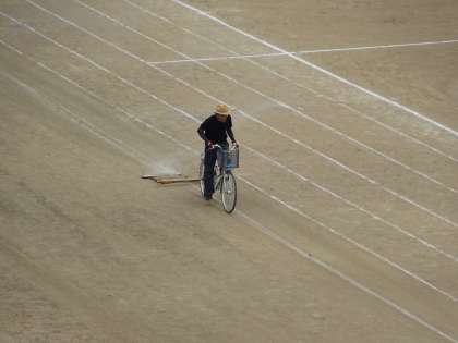 グラウンドで自転車に乗っている人を発見しました。体育大会のために、グラウンドをならしてくださっています。暑い中ありがとうございました。