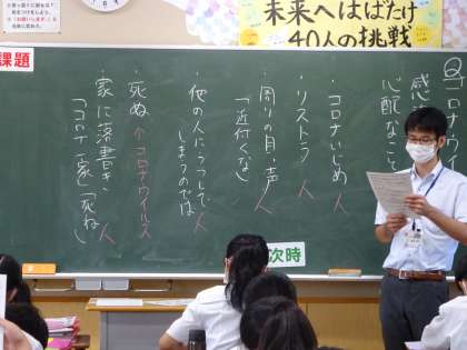 道徳の授業です。新型コロナウイルスに感染したら・・・という不安、心配があります。今日は、新型コロナウイルス関係の資料をもとに、相手の立場や気持ちを考えました。早く安心して生活できる幸せな日々が戻りますように・・・