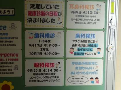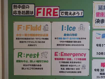 保健室前の掲示が変わりました。熱中症の応急処置の仕方と今後の検診予定を掲示しました。体育大会の練習等で熱中症予防を呼びかけていますが、もしものときの対応をみておきましょう。