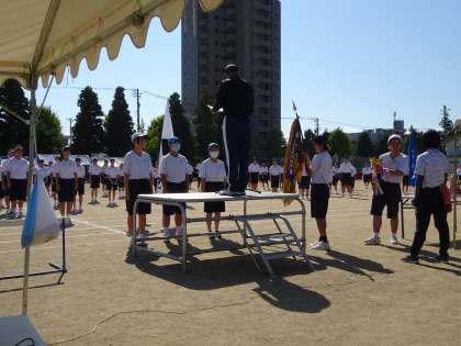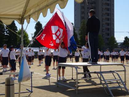 今日は予行練習です。朝から暑くなりましたが、休憩をはさみながらプログラムを通してやります。また、帽子をかぶっている生徒も見られました。写真は、開会式、閉会式の練習です。
