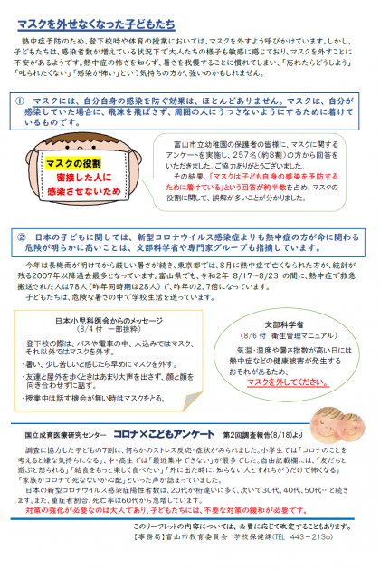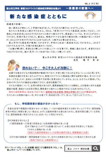 富山市立学校新型コロナウイルス感染症対策検討会議だよりVOL6が届きました。右のお知らせに掲載しましたのでご覧ください。また、明日生徒を通じて保護者の皆様に配付します。