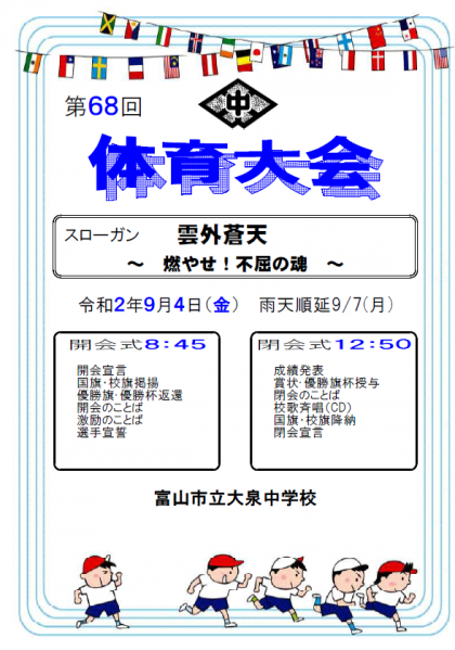 9月4日(金)体育大会のプログラムを配付しました。今年度は、熱中症対策、新型コロナウイルス感染症対策のため、平日開催、プログラムを縮小して行います。例年設置しておりました保護者用テントは設置しておりません。また、自宅で検温を行い、体調がよくない場合は来校をご遠慮いただきますようお願いいたします。