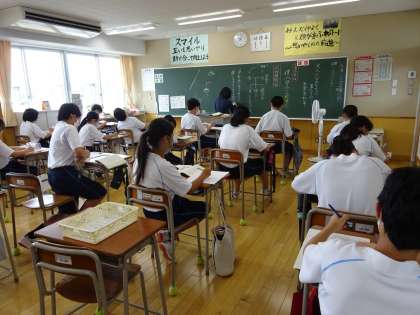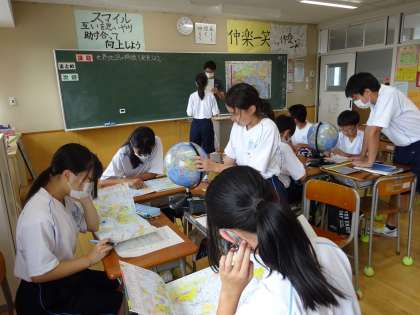 1学年は国語と社会の授業でした。社会では、先生からの問題を解くために、地球儀、地図帳等を使って考えていました。