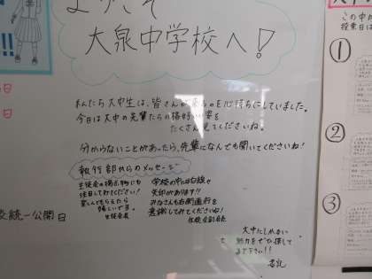 今日の午後は富山市統一学校公開日です。生徒玄関に、生徒会執行部がメッセージを書きました。来校をお待ちしています!!