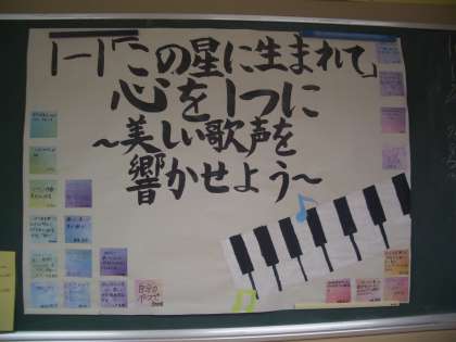 合唱コンクールに向けて掲示物ができました。心を1つにして素敵なハーモニーを作り上げましょう。
