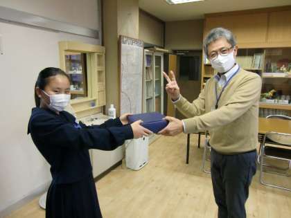 早朝テニスでテニスコートを使っておられる方からテニスボールをいただきました。校長先生からテニス部部長に贈呈されました。大切に使わせていただきます。ありがとうございます。