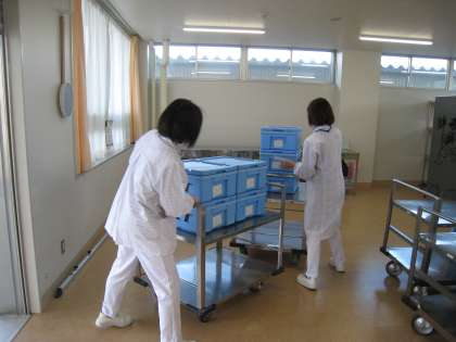 下 二人の配膳員さんで全校分の給食の準備をしておられます。