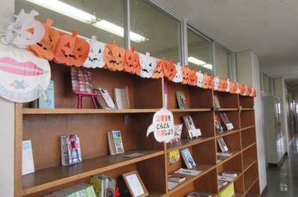 今日もたくさんの生徒が図書室を訪れました。ハロウィンの飾りも可愛らしいです。
