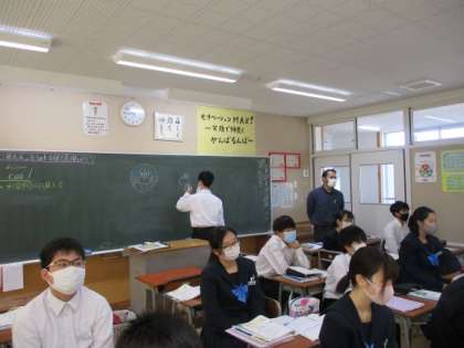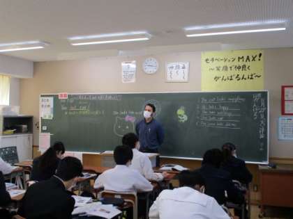 イラストを描く生徒以外は全員後ろを見て、英語のヒントを聞き、何のイラストなのかをあてる活動をしました。英語の授業でしたが、イラストも一生懸命に描いていました。