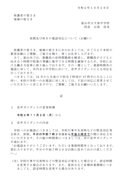11月2日から夜間及び休日の電話対応の時間が、生徒の下校完了時刻が17時30分になることに伴い変更になります。ご理解とご協力をお願いいたします。