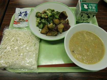 今日の給食はソフト麺、牛乳、ソフト麺の肉みそかけ、大学いも、ビーンズサラダ、味付小魚でした。