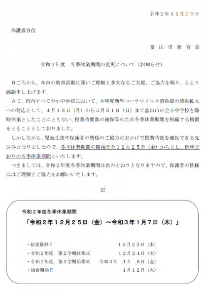 富山市教育委員会から「冬季休業期間の変更について(お知らせ)」が届きましたので、お知らせします。11月10日(火)生徒に配布しました。