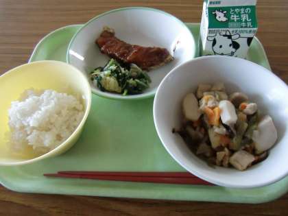 今日のメニューは、ごはん、牛乳、魚の甘みそかけ、ごまびたし、いなか煮でした。今日も美味しくいただきました。