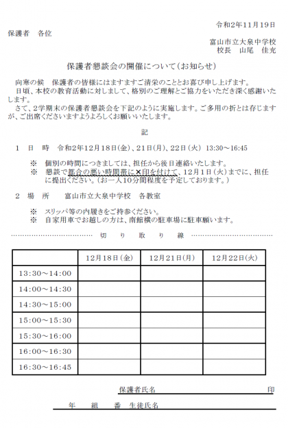 昨日、2学期保護者懇談会の案内を生徒に配布しました。