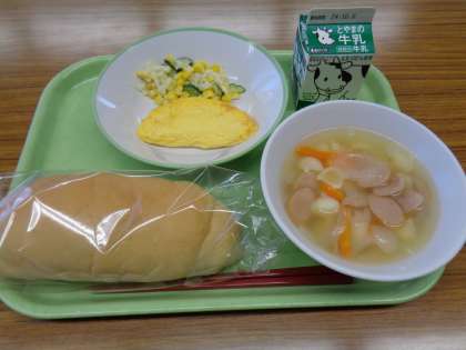 メニューはコッペパン、牛乳、チーズオムレツ、カラフルサラダ、マカロニスープでした。