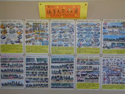 「体育大会への道」1年生の教室前に写真掲示がされています。