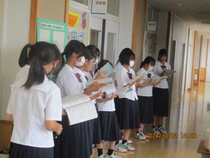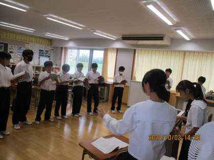 今日も放課後、合唱練習を行いました。今日は指揮者に合わせたり、ピアノを使って音程をとったりして、より良い合唱になるよう各クラスがんばっていました。*画像は1年生です。