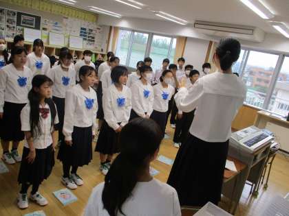 今日の合唱練習の様子です。音楽室・体育館のような広い場所ではなく、教室でも工夫してスペースをつくり、2つのパートや全体で合わせる練習が増えてきました。より美しいハーモニーを目指してがんばりましょう!*明日は中教研東部大会のため、放課後練習はありません。*画像は1年生の様子です。