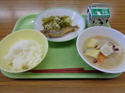 メニューはごはん、牛乳、ししゃものから揚げ、茎わかめの酢の物、さつま汁でした。