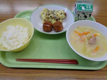 メニューはごはん、牛乳、ミートボール、チーズおさつ、豆乳野菜スープでした。秋の味覚サツマイモを使ったメニューがあり、秋を感じることができました。