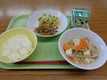 メニューは、ごはん 牛乳、小魚入りフライビーンズ、あわせ合え、はくさいなべでした。美味しくいただきました。