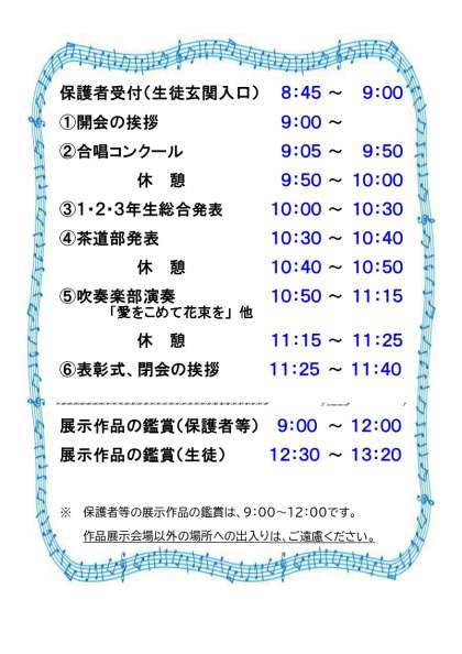 文化活動発表会プログラムです。生徒はこの日のために、たくさん努力を重ねてきました。是非本校に足を運んでいただき、生徒のがんばりをご覧下さい。