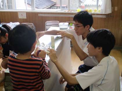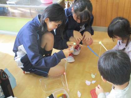 今日は、家庭科の体験学習で3年1組が保育所訪問を行いました。今回は清水保育所にご協力いただきました。生徒は夏休み中に制作した幼児のおもちゃを持参し、実際に遊んでもらいました。自分たちのおもちゃを喜んで遊んでもらえたり、たくさん話しかけられたりして、生徒はとても嬉しそうでした。なかには、仲よくなって膝の上で遊ぶ子もいました。非常に貴重な経験になり、よい学習の機会になりました。