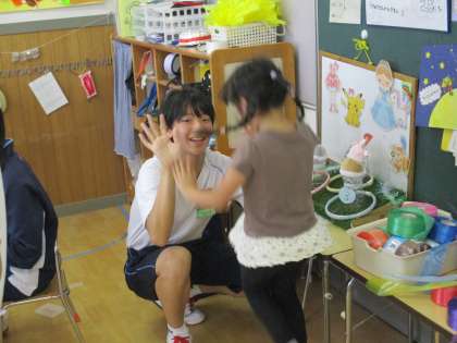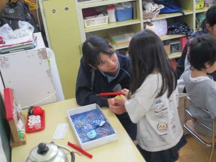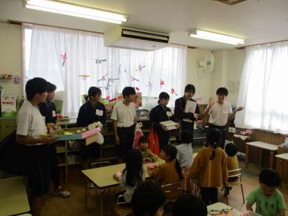 本日も家庭科の授業の中で、「保育所訪問」を行いました。昨日もお兄ちゃん先生、お姉ちゃん先生が来てたくさん遊んでもらったので、今日ははじめからかわいい笑顔で子ども達は迎えてくれました。普段、小さい子が苦手だと言っていた生徒も、帰りには「楽しかった。とてもかわいかった。」と笑顔で言っていました。