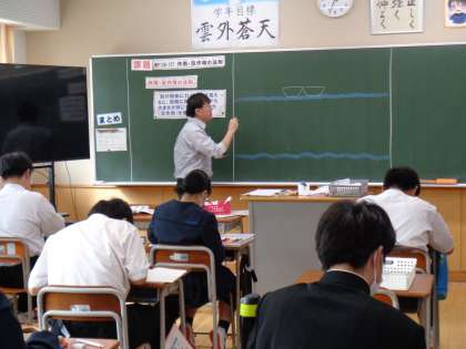 英語と理科の授業です。英語では困っている人を助けるときの会話を考えていました。理科では、作用反作用の力について考えていました。