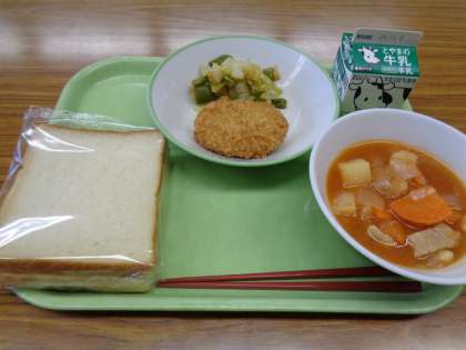 メニューは食パン、牛乳、かぼちゃコロッケ、アスパラサラダ、ポークビーンズでした。久しぶりの食パンでした。