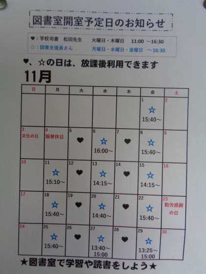 11月の予定です。月末に期末考査があるので、放課後の学習に図書室を使いましょう。