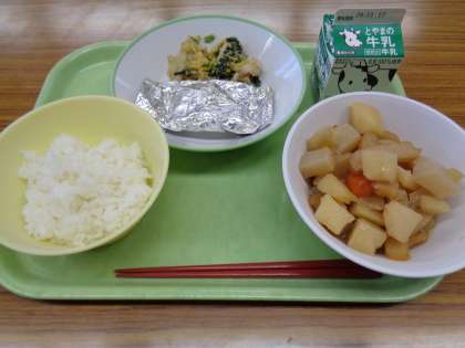 メニューは、ごはん、牛乳、さばの銀紙焼き、しめじのごま和え、関東だきでした。美味しくいただきました。