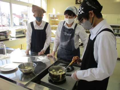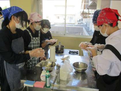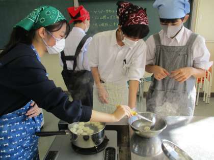 今日、家庭科の授業で3年生が調理実習を行いました。今回は、幼児のおやつの一例で「とうふだんご」を作りました。生徒は、どの班も声を掛け合いながら手際よく作業を行っていました。中には「家で受験勉強の合間に、作ってみようかな。」と言っている生徒もいました。*画像は3−1の様子です。