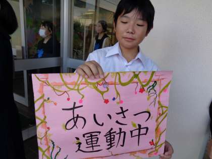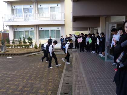 今日もさわやかな天気です。生徒玄関にはたくさんの生徒が挨拶に出ていました。さわやかな挨拶を交わしています。後期生徒会頑張っています。